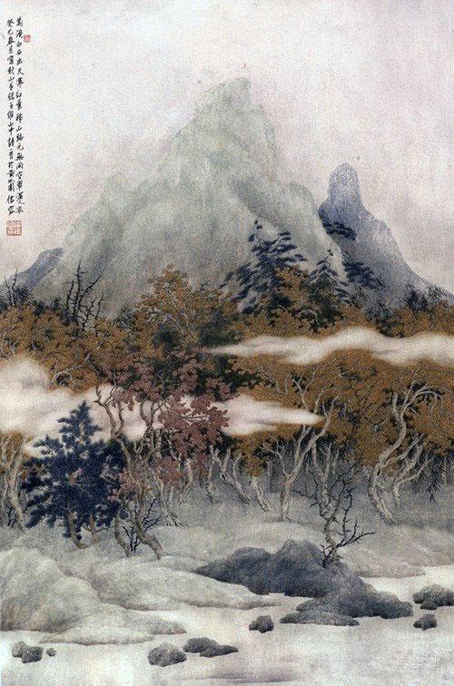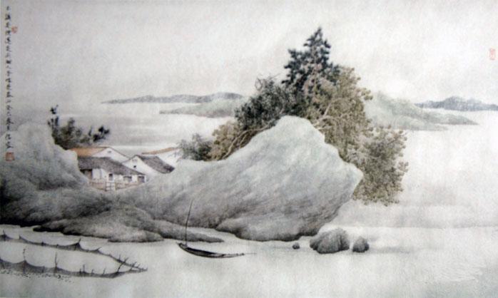 许信容有着深厚的传统文化修养,在他的绘画作品中蕴含唐诗宋词之意境,尤显东方语境下的文人情怀。他的笔墨直取宋元绘画意境,以静寂的田园、幽深的谷壑、悠远的浮云、葱郁林木等自然野逸情结,表达其超凡脱俗的诗意性。空灵、静谧、犹如浮世中的桃花源。因此,他的山水作品既具有中国工笔山水画那样的典雅和精致,又表达着一种当代人渴望宁静的内心需求。