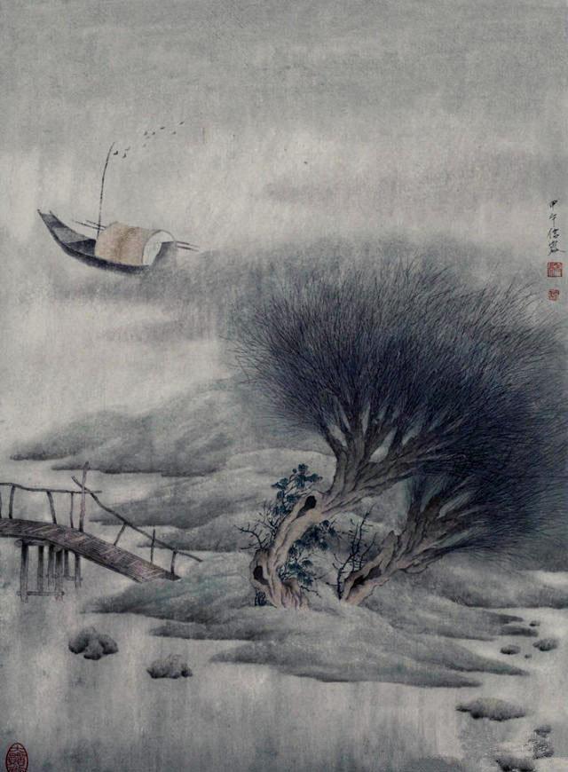 巧妙地利用西方绘画的空间造型,并不着痕迹的融西于中,也是许信容绘画艺术的独特之处。曾接受过西画教育的许信容,以自己独特的角度,将宋元意境与透视空间巧妙地糅合在一起,超越了传统样式,在形神境界和诗意空间方面将水墨精神做了现代阐释。此外,他的作品中又包含了一些现代人的图像关照方法,比如他的画镜头感很强,有类似于通过单反相机的镜头变焦以达到景深变幻、虚实相生的效果等。